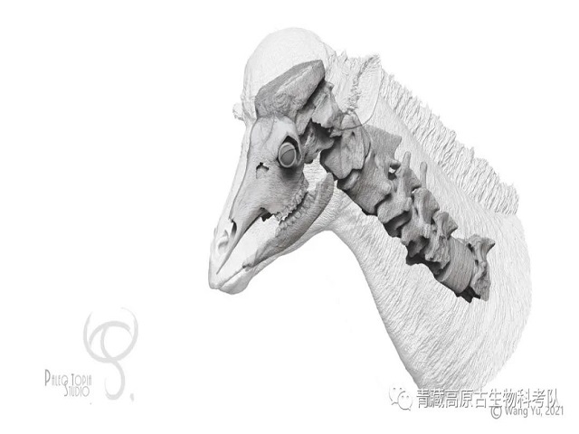 ——“头颅和颈椎是盘角鹿化石标本的三维扫描模型,保存了原始比例,我们拼合了一个幼年长颈鹿的面部,供你做复原形象参考。”